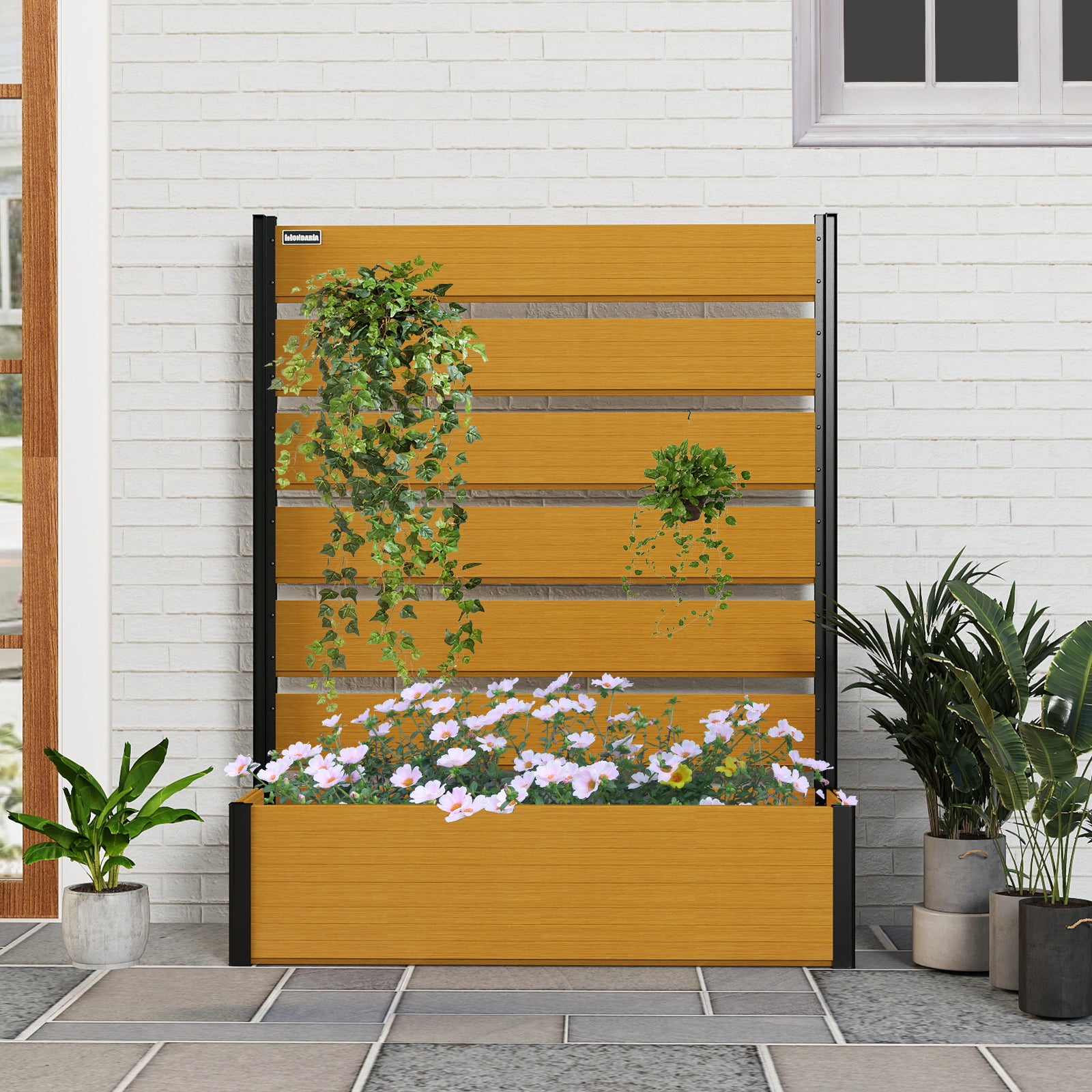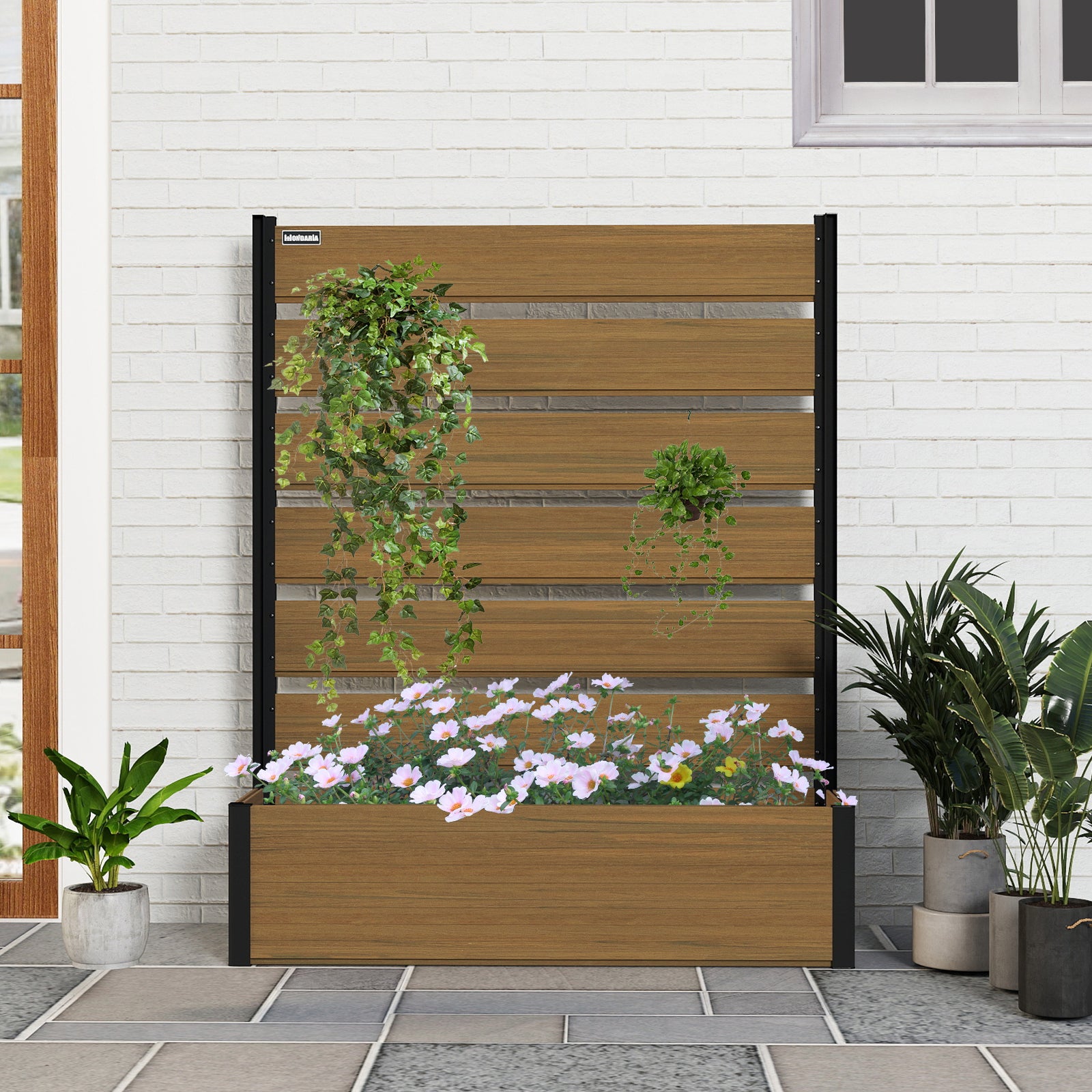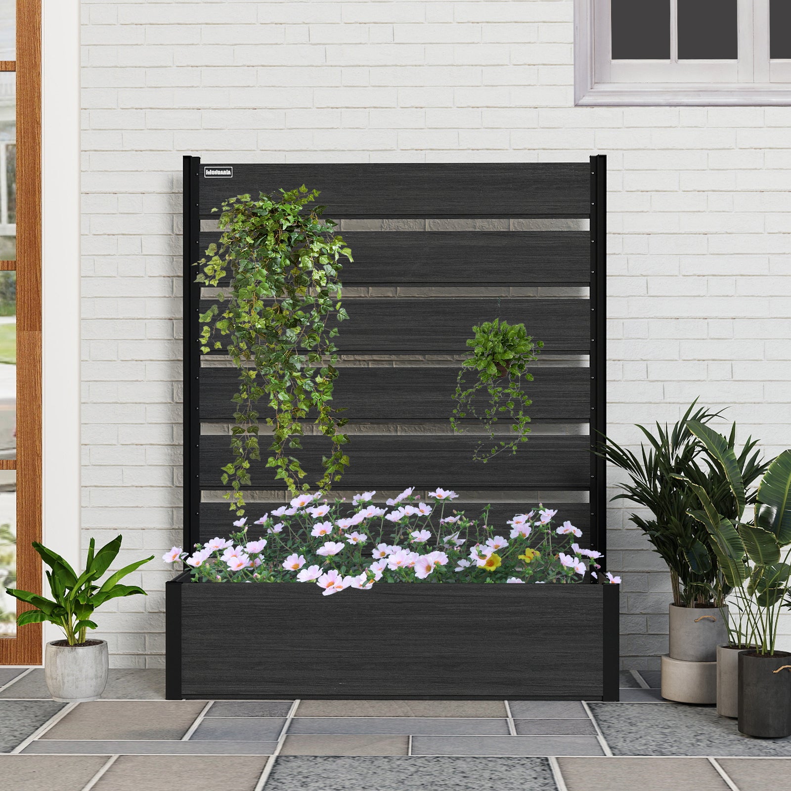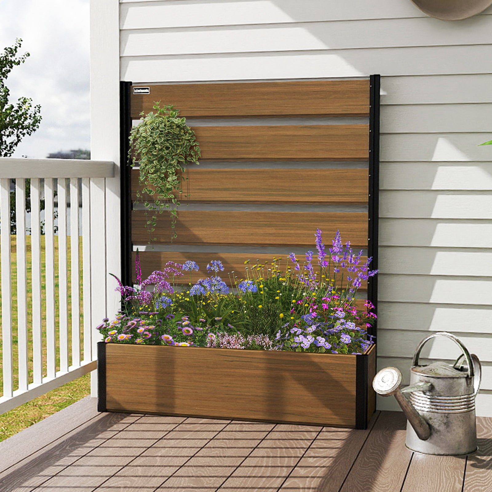 Modern & Stylish Design: Featuring sleek composite wood panels paired with a strong black aluminum frame, this planter bed is perfect for homeowners who want to create a private, sophisticated garden area while showcasing plants in a contemporary way.