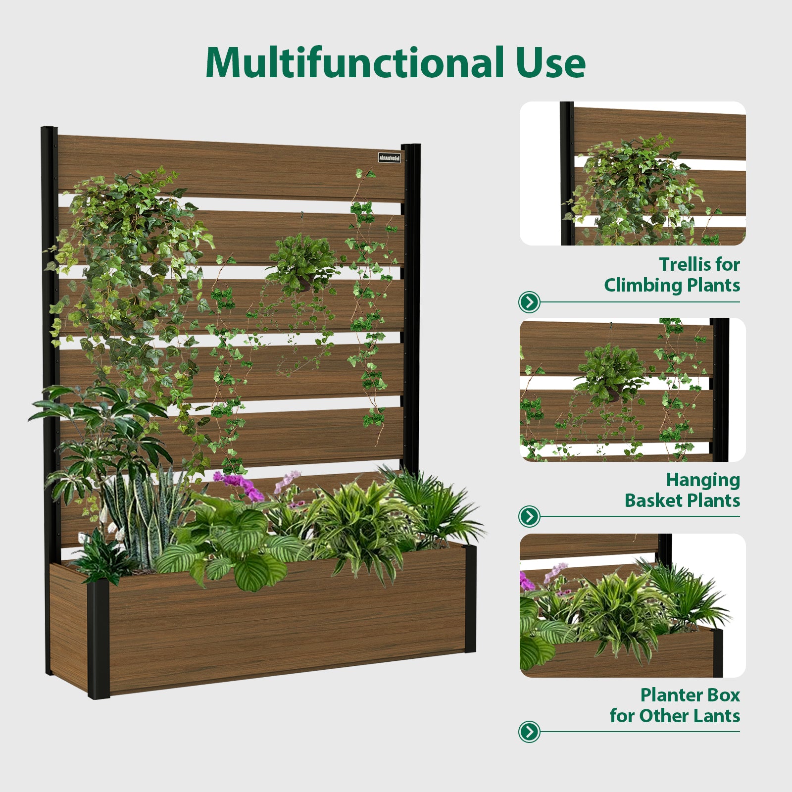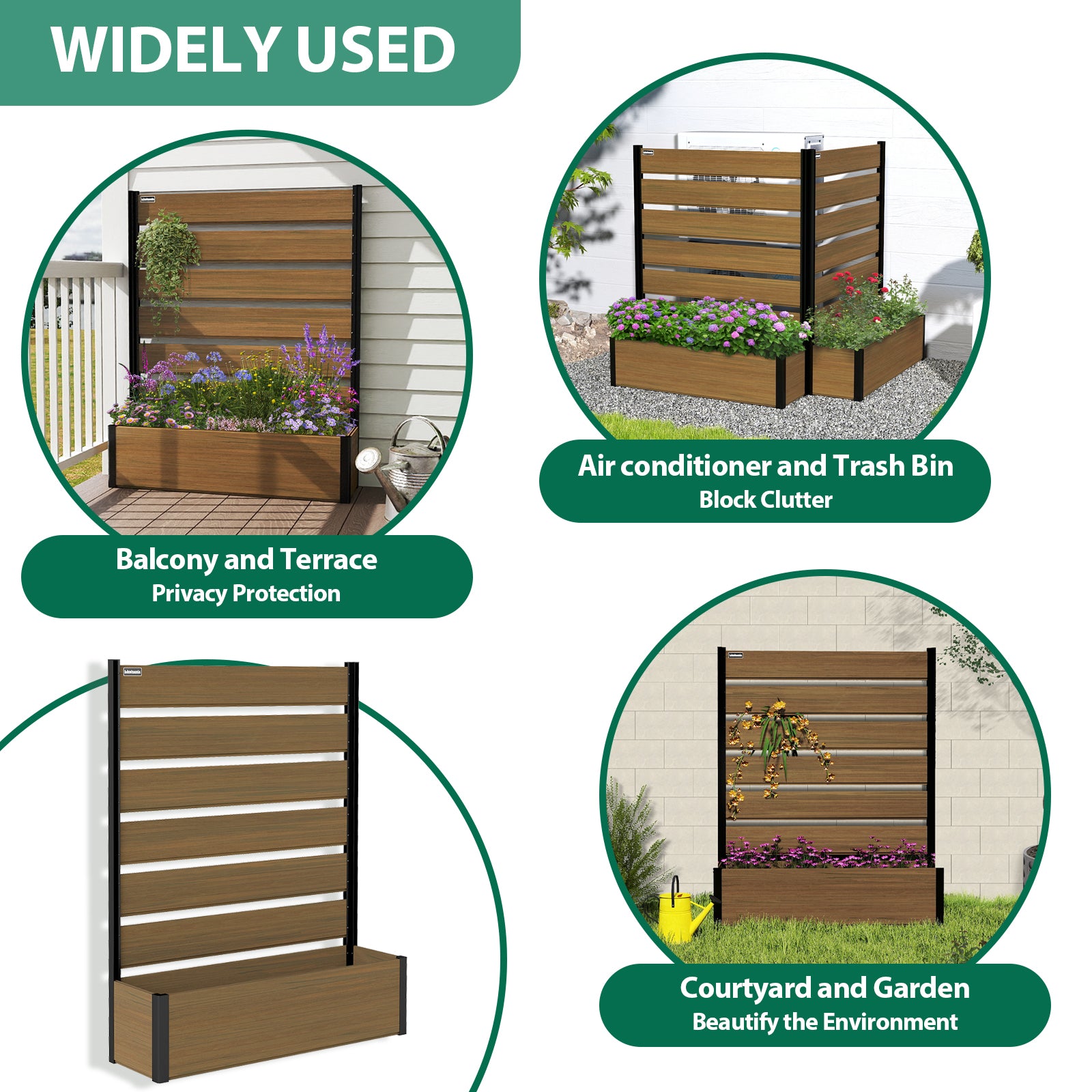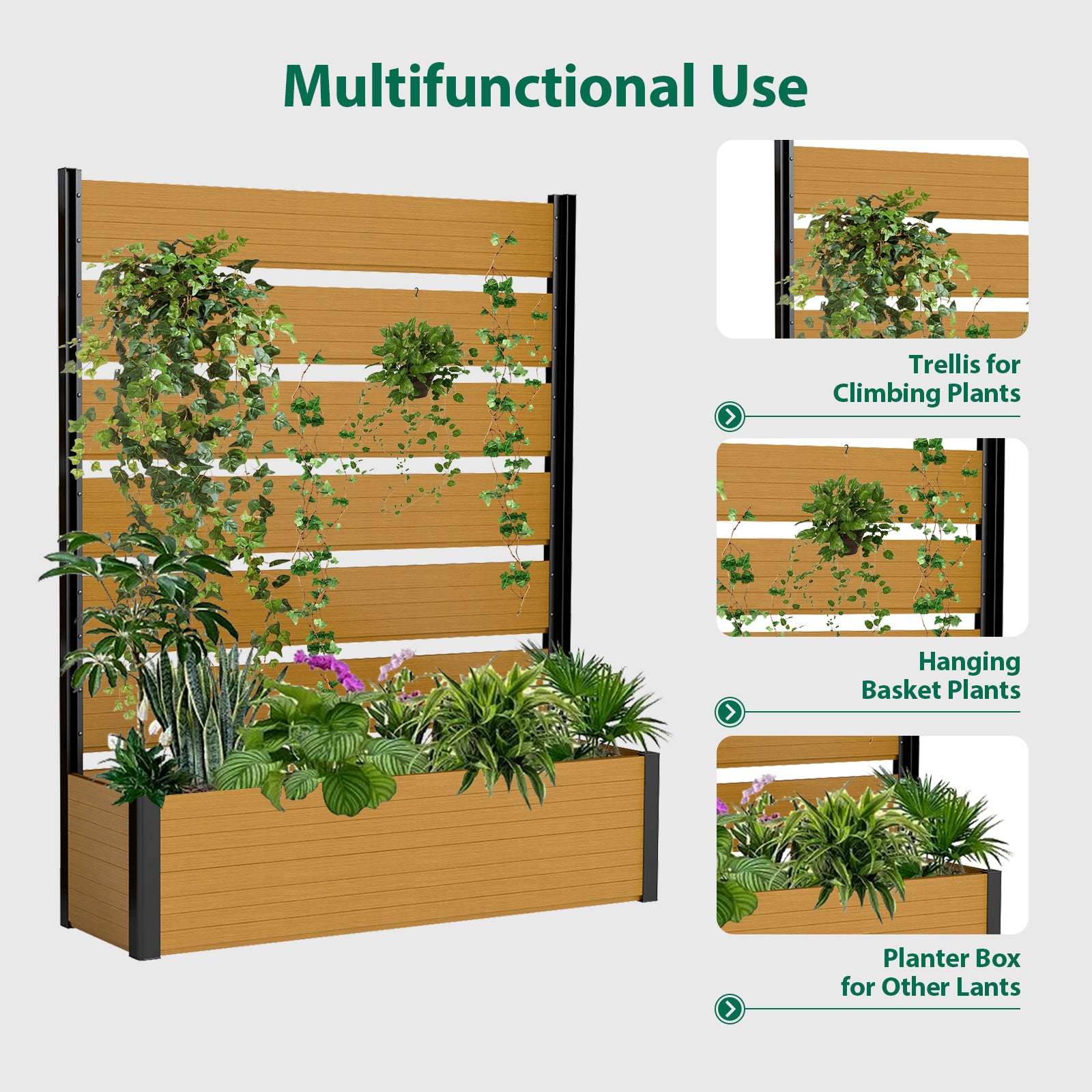 Modern & Stylish Design: Featuring sleek composite wood panels paired with a strong black aluminum frame, this planter bed is perfect for homeowners who want to create a private, sophisticated garden area while showcasing plants in a contemporary way.