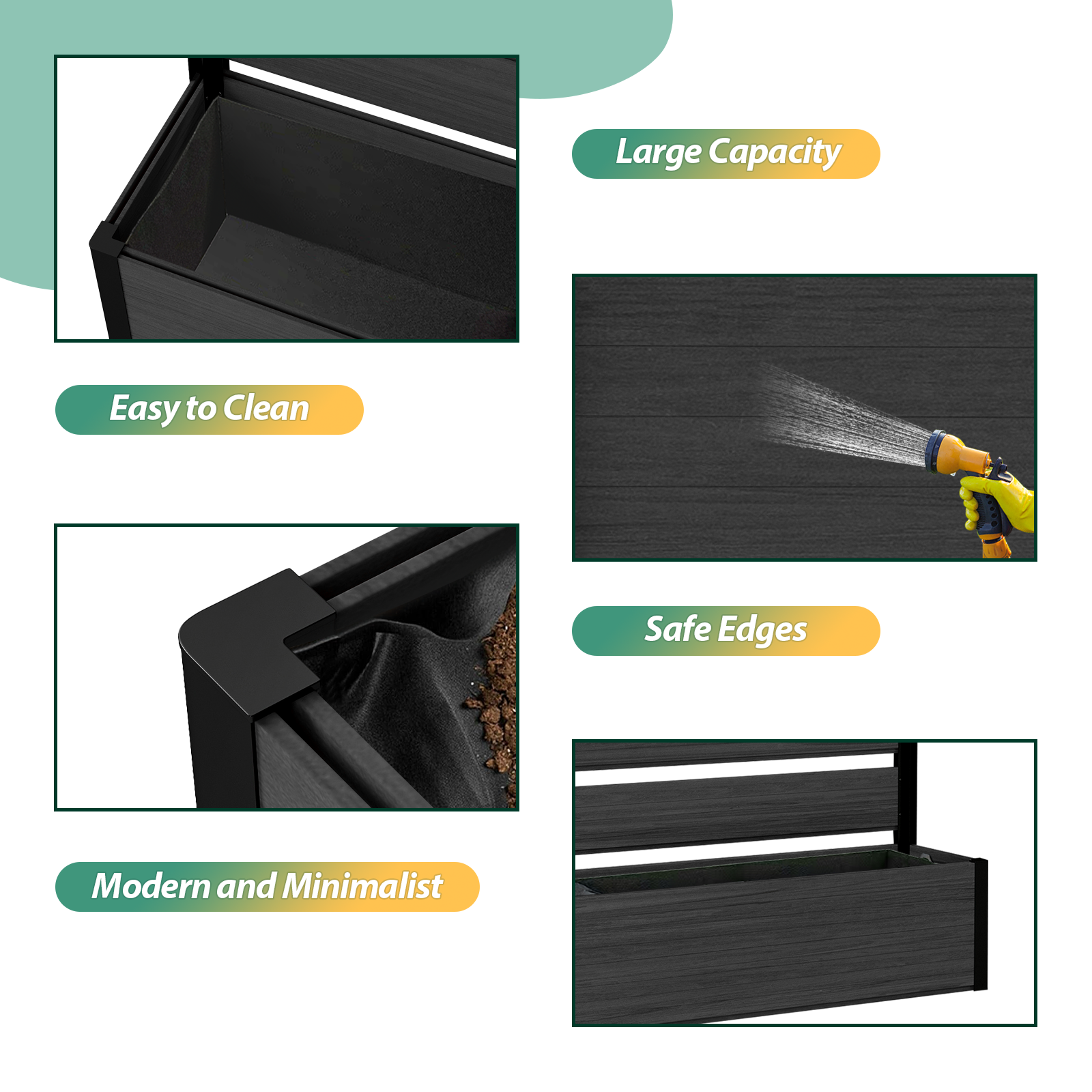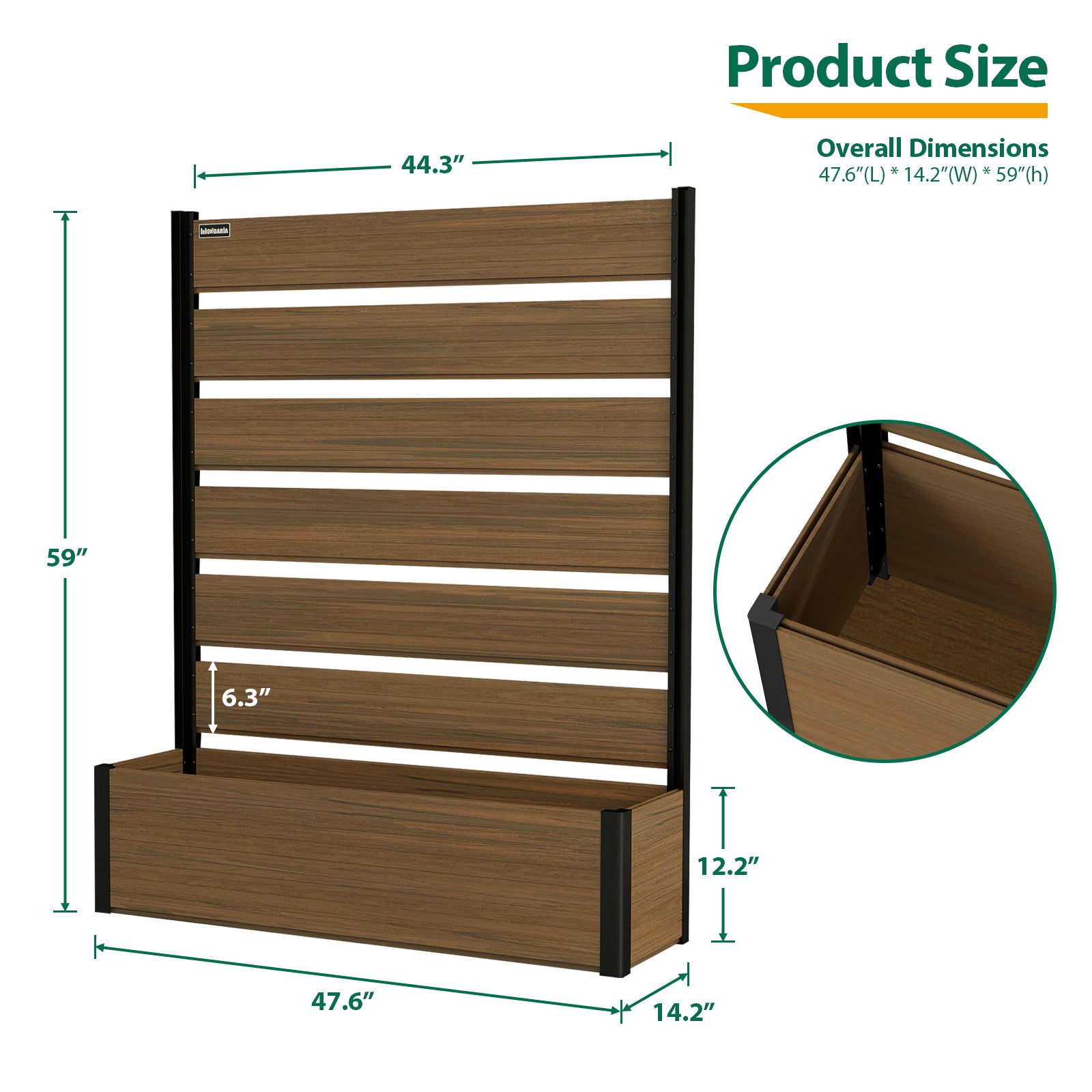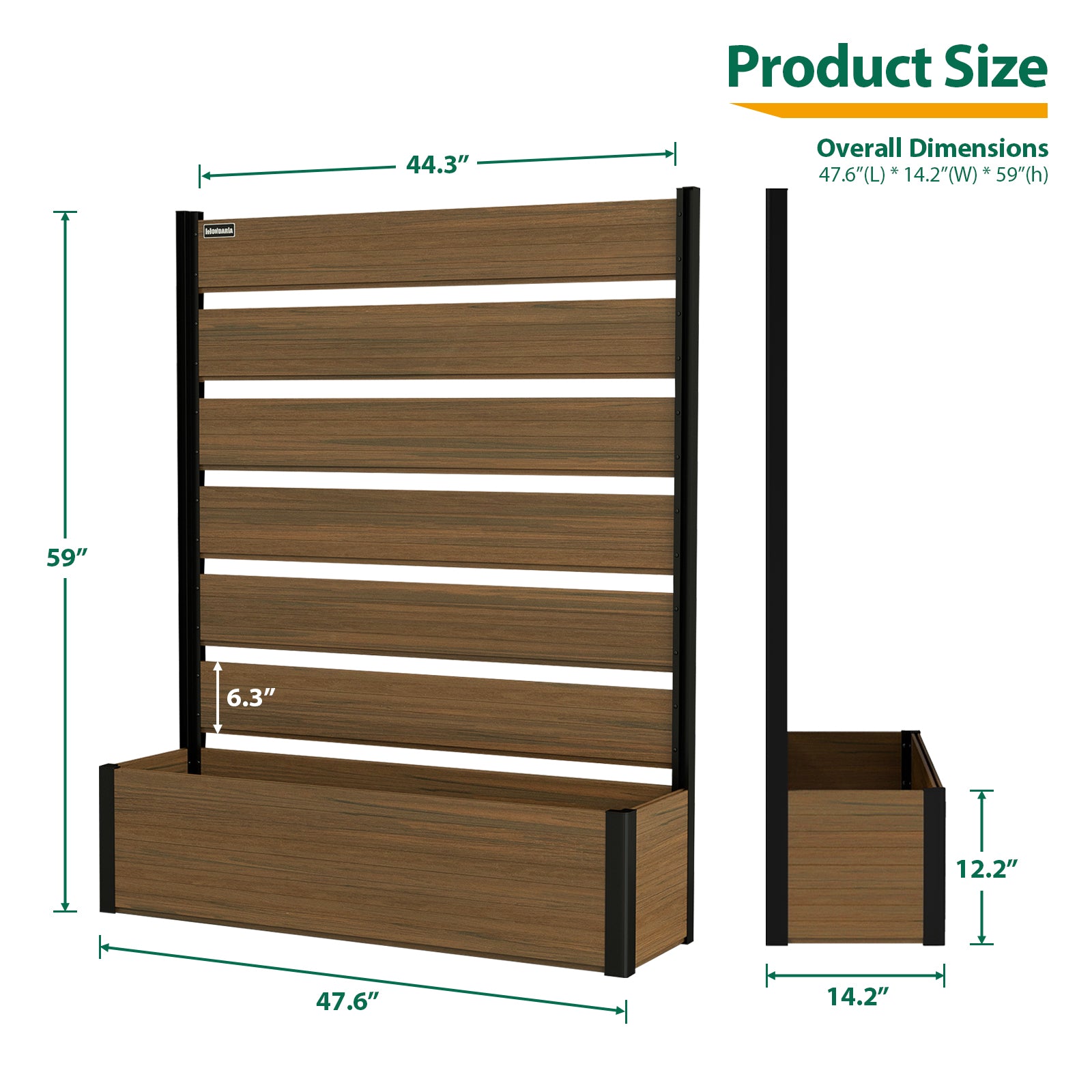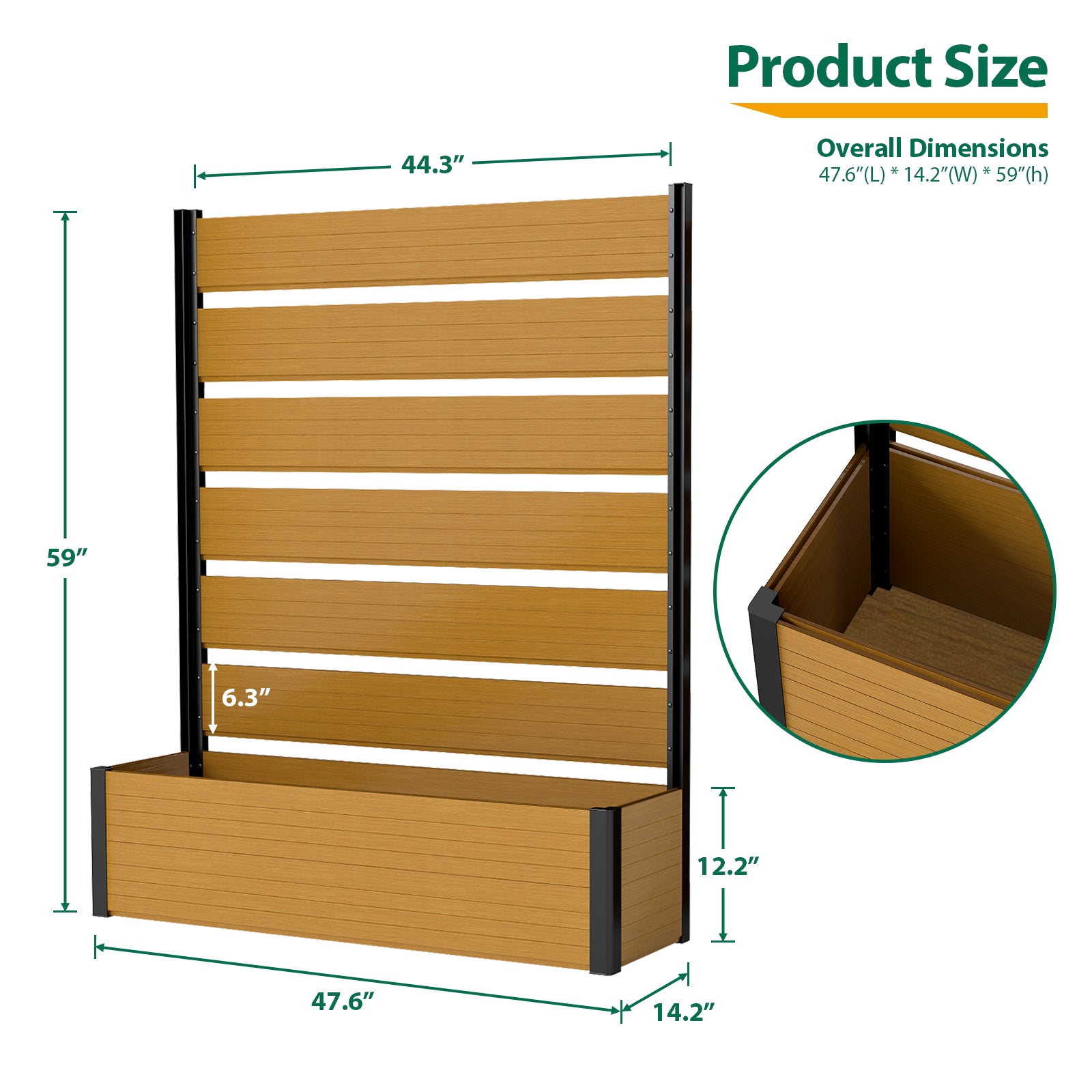Modern & Stylish Design: Featuring sleek composite wood panels paired with a strong black aluminum frame, this planter bed is perfect for homeowners who want to create a private, sophisticated garden area while showcasing plants in a contemporary way.