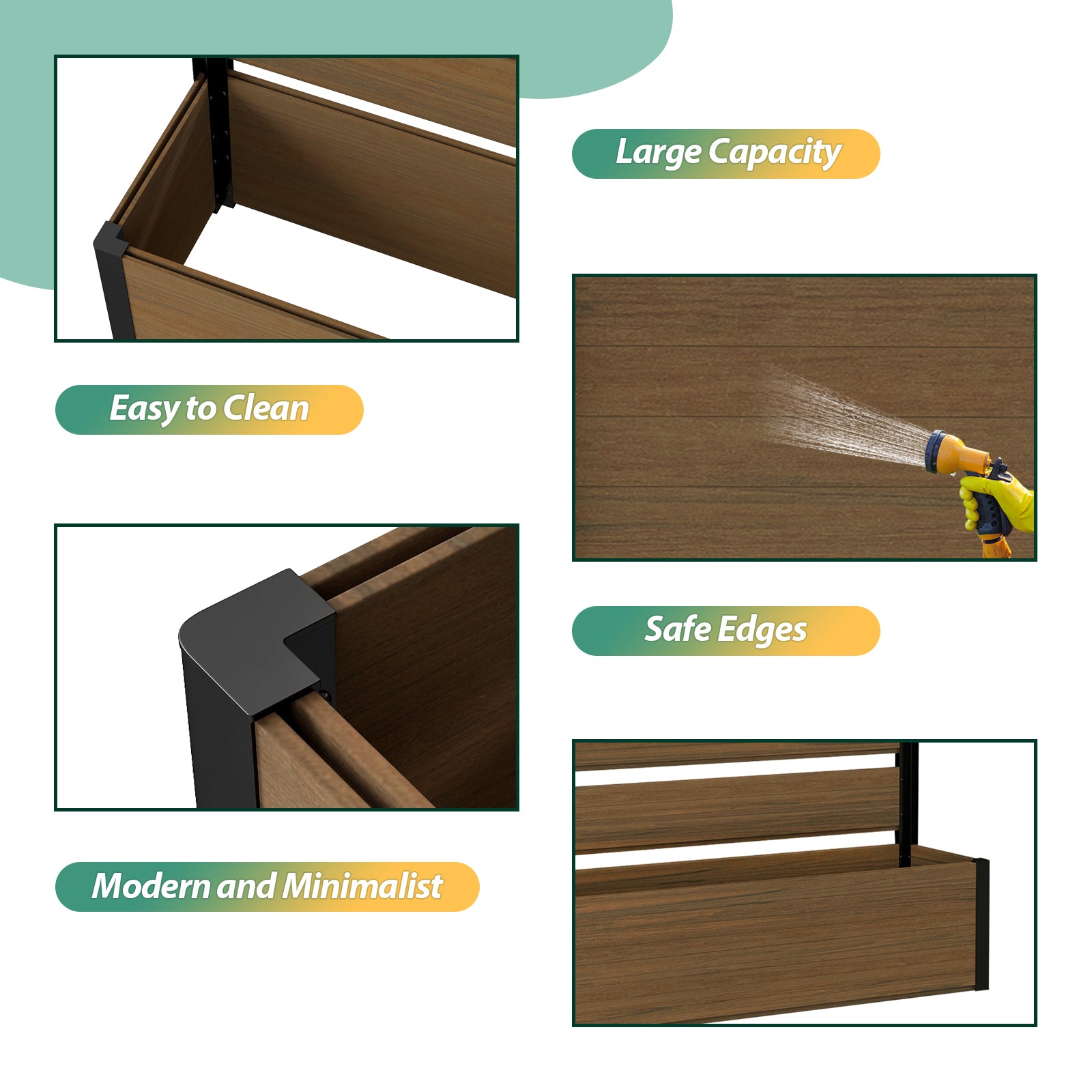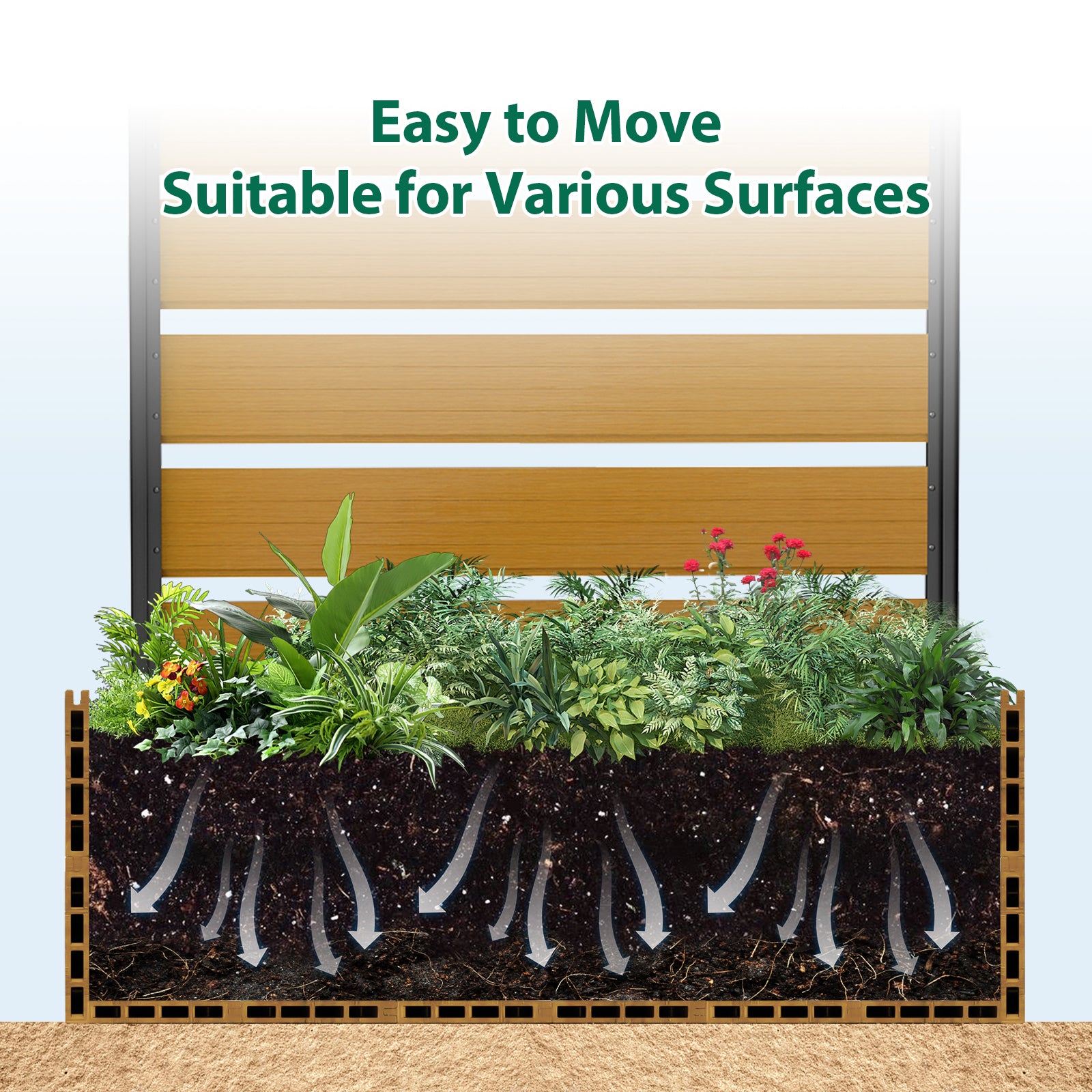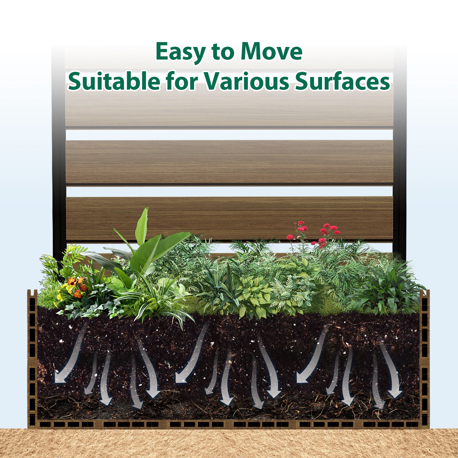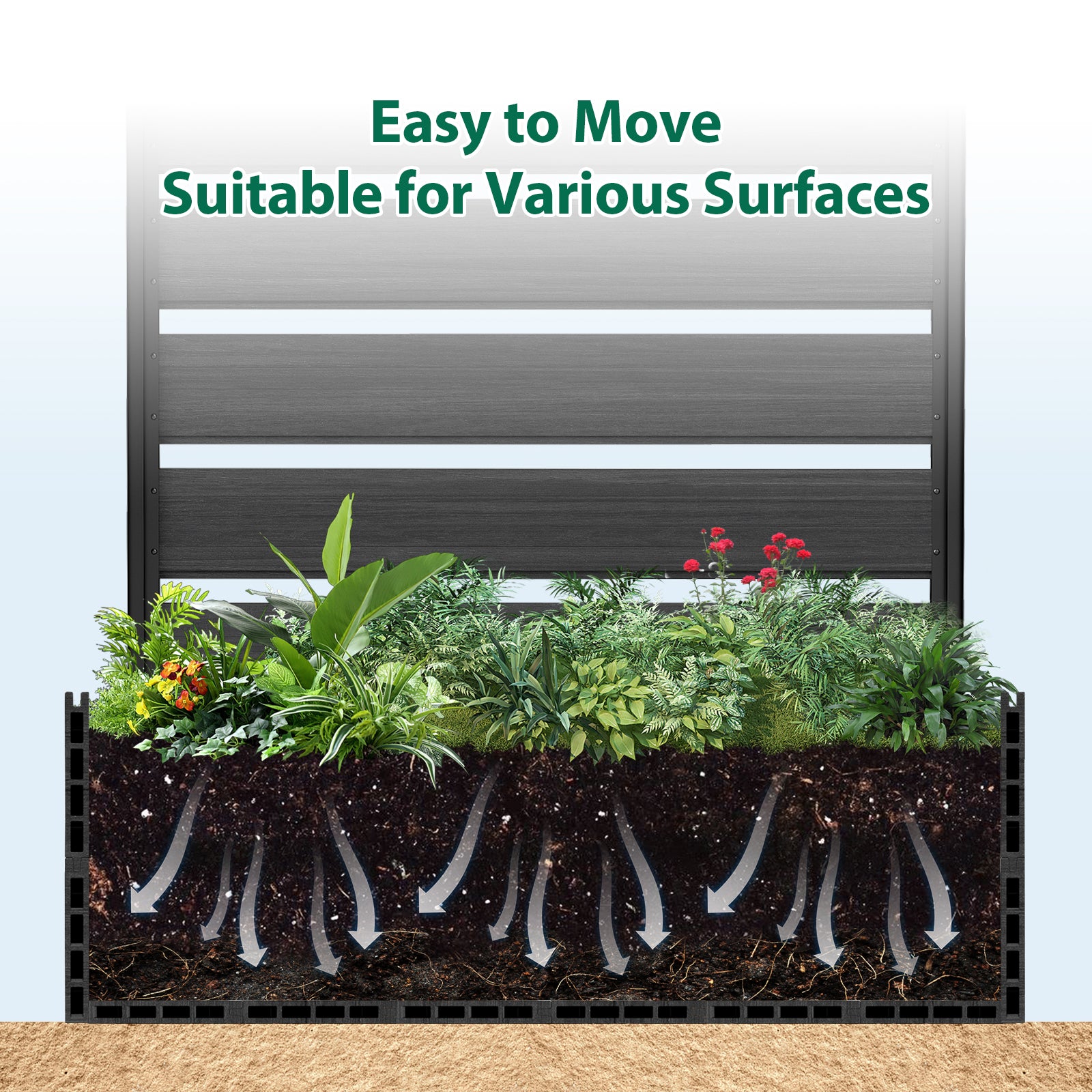 Durable & Long-Lasting: Crafted with weather-resistant composite wood and high-quality aluminum, this planter bed is built to withstand the elements, offering long-term durability and low maintenance. Whether in hot summers or cold winters, it will retain its beauty and function year after year.